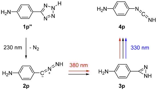 Summary of the UV-induced photochemistry of the 2H-tautomeric form of 5-(4-aminophenyl)-tetrazole 1p″ (Ar, 15 K): generation of C-(4-aminophenyl)-nitrilimine 2p and its subsequent photoisomerization to 4-aminophenyl-1H-diazirine 3p and 4-aminophenyl-carbodiimide 4p. Black, red and blue arrows represent the phototransformations at 230, 380 and 330 nm, respectively.