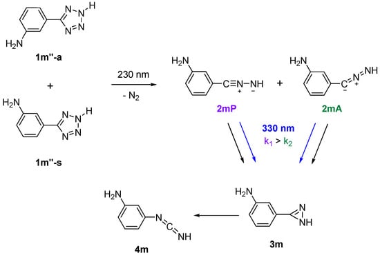 Summary of the UV-induced photochemistry of the 2H tautomeric form of 5-(3-aminophenyl)-tetrazole 1m″ (Ar, 15 K): generation of the propargylic (2mP) and allenic (2mA) bond-shift isomers of C-(3-aminophenyl)-nitrilimine 2m and their subsequent photoisomerization to 3-aminophenyl-1H-diazirine 3m and 3-aminophenyl-carbodiimide 4m with distinct kinetics. Black and blue arrows represent the phototransformations at 230 and 330 nm, respectively.