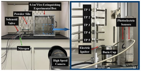 In this study, a full-scale fire suppression experiment was conducted within a confined space of 0.1 m3. The experimental setup is illustrated in Figure 1. The front of the experimental chamber is fitted with quartz glass for real-time observation and recording of the test process, ensuring a clean testing environment and the safety of personnel. Five thermocouples, designated as TP 1 through TP 5, were positioned along the vertical axis directly above the circular burn cup, spaced 20 mm apart, with TP 1 located at the cup rim. An 18 kV arc igniter was placed 2 mm above the rim of the burn cup. Photodetectors (FU-84C, Keyence, Osaka, Japan) were positioned 20 mm on either side of the burn cup to measure the optical density of the powdered aerosol in real-time and calculate the minimum extinguishing concentration (MEC) of the ultrafine dry powder extinguishing agent.