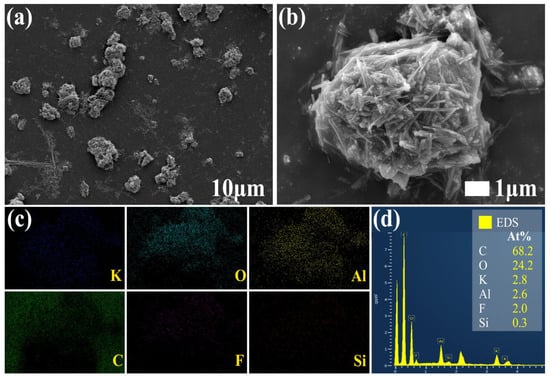 The scanning electron microscope images of M-UDWP are shown in Figure 2a,b. At a scale of 10 μm, significant agglomeration and adhesion among the powder particles were observed. The fibrous nature of KAl(OH)2CO3 crystals, characterized by a high aspect ratio and slender shape, predisposes them to aggregate through physical entanglement or electrostatic interactions. Following the introduction of the modifier, it became challenging for the fibrous powder surfaces to be completely exposed to the modifier due to their prior aggregated state. Consequently, the modifier tends to accumulate within the interstitial voids between the fibers rather than forming a uniformly thin film. At a scale of 1 μm, the modifier was observed to aggregate within the voids between fibers, causing the fiber powders to adhere into clusters and form spheroidal structures. However, a substantial number of fibrous structures or branches remained exposed outside the coating layer.