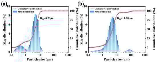 Particle size distribution and cumulative distribution of UDWP (a) and M-UDWP (b).