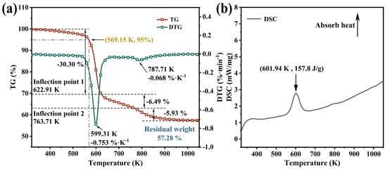 The TGA curve of M-UDWP is presented in Figure 6a. Under a nitrogen atmosphere, the temperature at which M-UDWP exhibits a 5% weight loss is 569.15 K, equivalent to 296 °C, meeting the requirements of the JTCG report. The weight loss percentage of M-UDWP at temperatures up to 373.15 K is approximately 0.14%, attributed to the evaporation of crystallization water molecules within M-UDWP. The DTG curve showcases two maxima at 599.31 K and 787.71 K, with corresponding weight loss rates of 0.753%·K−1 and 0.068%·K−1, respectively. The TG curve also demonstrates three distinct stages of mass loss.