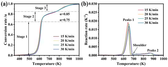 In addition, the curves of the thermal decomposition conversion rate of M-UDWP as a function of temperature under the nitrogen atmosphere at heating rates of 15, 20, 25, and 30 K/min are depicted in Figure 7a. The conversion rate curves exhibit two inflection points at α = 0.65 and α = 0.85, similar to the TG curves. The reaction rate curves, shown in Figure 7b, resemble the derivative thermogravimetric trends, displaying two peaks and one shoulder, thereby delineating the thermal decomposition process of M-UDWP into three stages. Across the four heating rates, the differences in peak reaction rates, shoulder reaction rates, stage reaction rates, and total reaction rates are minimal. However, the reaction rates at the first peak, shoulder, and second peak decrease with increasing heating rates, as summarized in Table 2.