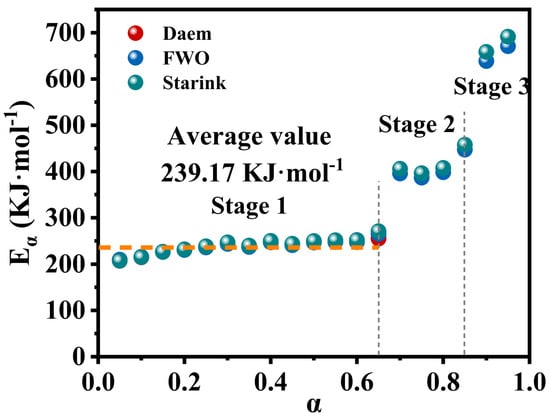 Krasnyansky [40] identified that activation energy is a key parameter in understanding the fundamental physical and chemical mechanisms by which dry powder extinguishants influence flames. Subtle changes in the activation energy (Eα) during specific decomposition stages may indicate a single-step reaction process. Consequently, analyzing the variations in activation energy during thermal decomposition is of significant importance. Figure 8 illustrates the changes in E values of M-UDWP at different conversion rates (α) calculated using three model-free methods. At uniform conversion rates (α), the differences in activation energy values derived from the three model-free methods are similarly minimal, allowing the reaction stages to be divided into three phases: Stage 1 (0.05 ≤ α ≤ 0.65), Stage 2 (0.65 ≤ α ≤ 0.85), and Stage 3 (0.85 ≤ α ≤ 0.95), which correspond well with the phases delineated by the conversion rate curves. The activation energy in the first stage incrementally increases and can be treated as a single-step reaction process. Notably, the average activation energy for the first stage is 239.17 kJ/mol, which is lower than the previously calculated activation energy of 357.67 kJ/mol for the first stage of UDWP decomposition [19]. This lower activation energy suggests that the oleophobic/hydrophobic-modified M-UDWP has a reduced energy barrier for thermal decomposition in a fire scenario, enabling rapid pyrolysis and efficient early-stage fire suppression.
