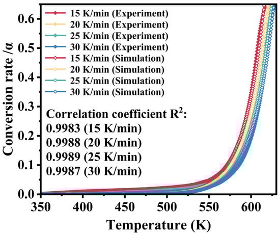 The experimentally measured and predicted α values as a function of temperature for M-UDWP are displayed in Figure 9. Within the corresponding range, the predicted data align well with the experimental data, with a correlation coefficient (R2) exceeding 0.998, thereby demonstrating that the derived kinetic parameters reliably predict the first-stage thermal decomposition behavior of M-UDWP under a nitrogen atmosphere.