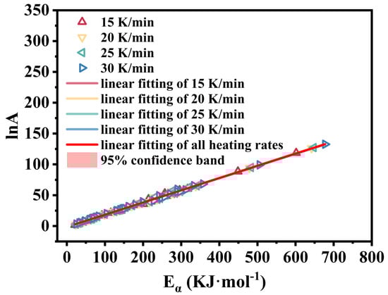 As shown in Figure 10, the compensation effect linear fit between lnA and Eα at four different heating rates, as well as the overall linear fit, yield R2 values exceeding 0.99. This demonstrates that the 36 model functions selected in this study align well with the thermal decomposition process of M-UDWP. Relevant information on the KCE of M-UDWP is presented in Table 4. The iso conversional temperature (Tiso) for the first stage is 606.9 K, corresponding to the decomposition temperature range of 350–666 K and indicating the feasibility of the model function used in the CR method.