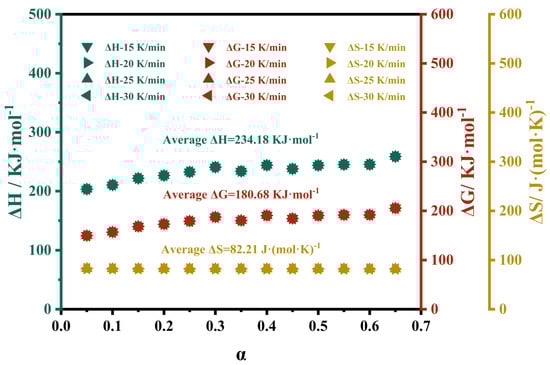 Thermodynamic parameters such as ΔH, ΔG, and ΔS are commonly used to analyze the thermal decomposition behavior of solids. Among these parameters, ΔH is used to assess the favorability of the thermal transformation process [41], ΔG is used to evaluate the feasibility and direction of the reaction [28], and ΔS is used to determine the degree of disorder in the thermal transformation process [35]. At heating rates of 15, 20, 25, and 30 K/min, the values of ΔH, ΔG, and ΔS as functions of α are shown in Figure 11. The results indicate that for M-UDWP, within the range of 0 ≤ α ≤ 0.65, the heating rate has little impact on the average values of ΔH, ΔG, and ΔS, which are 234.18 kJ·mol−1, 180.68 kJ·mol−1, and 82.21 J·(mol·K)−1, respectively, in the first stage of decomposition.