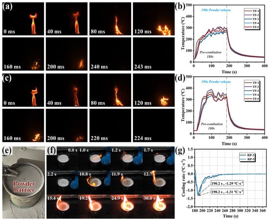 High-speed photography of the fire extinguishing process of #PR-3 flame (a) and #PR-5 flame (c); fire extinguishing temperature curve of #PR-3 flame (b) and #PR-5 flame (d); combustible surface after flame extinguishing with M-UDWP (e); M-UDWP re-ignition time delay test high-speed photography (f); and cooling rate curve of #PR-3 flame and #PR-5 flame (g).