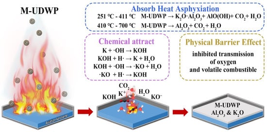Between 251 °C and 411 °C, M-UDWP decomposes into K2O·Al2O3, AlO(OH), CO2, and H2O. Compared to M-UBDP, this allows M-UDWP to absorb heat from the surrounding environment at lower temperature stages (earlier stages of a fire), thereby reducing the fire scene temperature. The significant amount of CO2 generated during decomposition creates an inert gas atmosphere in the combustion zone, inhibiting combustion. The decomposed products K2O and Al2O3 also act as flame retardants, preventing fire spread. Between 410 °C and 700 °C, the modified coating of M-UDWP continues to decompose, producing carbon dioxide to further inhibit fire spread.
