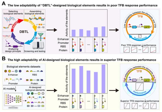 Design of biological elements to regulate the TFB response performance: (A) The low adaptability of “DBTL”-designed biological elements results in poor TFB response performances. (B) The high adaptability of AI-designed biological elements results in superior TFB response performances.