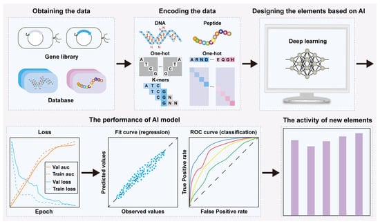 Biological elements (bio-elements) are the fundamental building blocks of synthetic biological systems, consisting of molecular sequences with specific functions. These bio-elements include nucleic acids, such as promoters, enhancers, and ribosome binding sites (RBS), as well as proteins, such as transcription factors (TF) and enzymes. The rapid development of synthetic biology has made the rational design of bio-elements and the precise prediction of their activity key areas of research [1,2,3,4,5]. However, the sequences and functions of bio-elements are complex, and their intrinsic relationships remain unclear. Traditional methods for designing bio-elements and predicting their activity often suffer from being time-consuming, costly, unreliable, lacking clear optimization directions, and having insufficient relevant biological theories. Fortunately, the rapid development of machine learning algorithms in artificial intelligence (AI), such as support vector machines, logistic regression, and decision trees, combined with big data, has shown excellent performance in various fields [6,7,8,9,10]. Machine learning possesses strong capabilities to understand biological data and make autonomous decisions, enabling the extraction of hidden features within biological data that are difficult to obtain through experimental methods [11,12]. Deep learning [13], a new branch of machine learning, can efficiently learn latent patterns in data [14,15]. For example, convolutional neural networks (CNNs, a type of feed-forward neural network that incorporates convolutional calculations and has a deep architecture) and recurrent neural networks (RNNs, a type of neural network designed to take sequence data as input and recursively process it in the order of the sequence) can achieve precise predictions of bio-element activity by learning sequence features [16,17,18,19,20]. Generative adversarial networks (GANs, a type of generative deep learning model that consists of two competing components, a generator and a discriminator, which are trained simultaneously to generate realistic synthetic data) can achieve de novo design of bio-elements through adversarial training between generators and discriminators [21,22,23,24]. Therefore, AI-guided de novo design and precise activity prediction of bio-elements present new opportunities for bio-element research.
