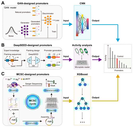 Predicting promoter activity also faces challenges such as high costs and low accuracy. To address these issues, Zhao et al. proposed a promoter strength prediction method based on the eXtreme Gradient Boosting model (XGBoost, a powerful machine learning algorithm based on decision trees, optimized for efficiency, accuracy, and handling large datasets through gradient boosting techniques) (Figure 3C) [48]. By constructing a gradient transcription intensity Trc promoter (Ptrc) mutant library dataset based on the mutation–construction–screening–characterization (MCSC) cycle, the XGBoost model was trained, achieving a prediction accuracy of 0.88 [48]. Similarly, Qiao et al. developed the iPro-GAN model, which used spatial data analysis to extract the sequence features based on the Moran model and employed the deep convolutional GAN model to achieve high-precision predictions of promoter transcription intensity, ultimately reaching a prediction accuracy of 0.92 [49]. These examples demonstrate AI algorithms’ potential in the rational design and precise activity prediction of promoters.