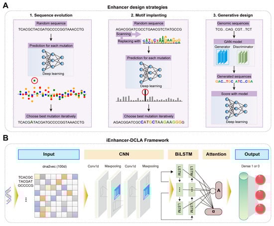 Enhancers, typically containing multiple motifs such as transcription factor binding sites (TFBS), are short regions within eukaryotic sequences that can bind to proteins and enhance gene transcription, playing a crucial role in regulating gene expression [64,65]. However, the de novo design and activity prediction of enhancers is challenging due to the unclear relationship between motif syntax and enhancer activity, the inadequate compatibility between motifs, and the limited applicability [66]. To solve these challenges, Almeida et al. developed DeepSTARR, a CNN-based deep learning framework, achieving efficient prediction of enhancer activity in Drosophila S2 cells with a Pearson Correlation Coefficient (PCC, a statistical measure that evaluates the strength and direction of the linear relationship between two variables, often used to assess the performance of a model by comparing predicted values to actual outcomes) of 0.74 [50]. Experimental validation based on the prediction results revealed some motif syntax rules. Using these rules, they designed novel enhancer sequences with gradient activities ranging from 0.8 to 630 [50]. Taskiran et al. further realized the de novo design of synthetic enhancers based on cell types using various AI algorithms (Figure 4A) [67]. First, they used AI algorithms for directed sequence optimization and the insertion of TFBS into enhancers, analyzing the impact of changes in repressive sites and TFBS on enhancer activity [67]. Then, they compared Drosophila enhancers designed using these strategies with human enhancers generated by a GAN model, demonstrating the applicability of these design strategies to different biological systems [67]. In addition, Liao et al. developed iEnhancer-DCLA, a novel deep learning framework, to predict enhancer activity (Figure 4B) [51]. First, they encoded sequences using data encoding methods such as word embedding, one-hot encoding, and k-mers to determine the most suitable approach for enhancer sequences [51]. Then, they combined algorithms like CNN, LSTM, and attention mechanisms to thoroughly extract sequence features [51]. The model achieved an accuracy of 0.83 in predicting enhancer activity. Thus, AI algorithms have shown significant potential in the rational design and precise activity prediction of enhancers [68,69].