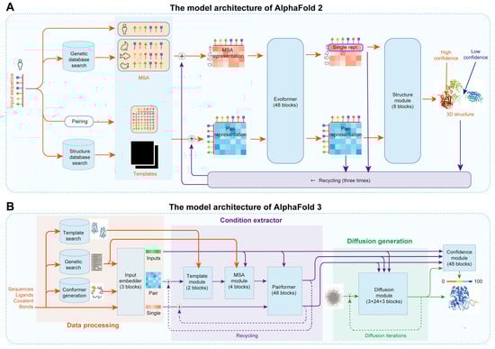 AlphaFold has revolutionized protein structure prediction based on amino acid sequences [56,78,79,81]. For example, AlphaFold 2, developed by Jumper et al., combines multiple sequence alignments (MSA) and neural networks to achieve near-experimental accuracy in predicting 3D protein structures (Figure 5A) [56]. The model integrates evolutionary, physical, and geometric information, resulting in significantly improved median backbone accuracy as demonstrated in the 14th Critical Assessment of Protein Structure Prediction (CASP14) [82]. AlphaFold 2 achieved a high TM-score of over 0.78 [56]. Despite its advancements, AlphaFold 2 faced challenges such as limited accuracy in predicting complex biomolecular interactions and computational efficiency. To address these challenges, Abramson et al. developed AlphaFold 3, which integrates a diffusion-based architecture to predict the joint structure of complexes, including proteins, nucleic acids, and small molecules, improving accuracy by reducing the complexity of MSA processing and directly predicting raw atom coordinates through a diffusion module (Figure 5B) [57]. AlphaFold 3 achieved an unprecedented accuracy of over 0.8 across various benchmarks, such as protein–ligand and protein–nucleic acid interactions [57]. Thus, AI algorithms provide a crucial direction for the de novo design of proteins.