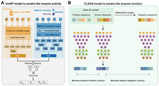 AI-derived prediction of enzyme activity and function: (A) The overview of UniKP to predict the enzyme kinetic parameters. First, the pretrained language model, ProtT5-XL-UniRef50, is used to encode enzyme information. Each amino acid is transformed into a 1024-dimensional vector in the last hidden layer. These vectors are then averaged using mean pooling to generate a 1024-dimensional vector representing the enzyme. Next, the pretrained language model, the SMILES transformer, is used to encode substrate information. The substrate structure is converted into a Simplified Molecular Input Line Entry System (SMILES) representation and fed into the SMILES transformer to generate a 1024-dimensional vector. This vector is created by concatenating the average and max pooling of the last layer and the first outputs of the last and penultimate layers. Finally, an interpretable Extra Trees model based on machine learning uses the concatenated representation vectors of the enzyme and substrate as input to predict the kcat, km, or kcat/km values. (B) The overview of CLEAN for the prediction of enzyme function. During training, positive and negative samples are selected based on EC numbers. The input sequences are embedded and processed through a neural network. The warm-colored grid series represents the embeddings of the input sequences from ESM-1b. Similarly, the embeddings obtained from the supervised contrastive learning neural network are depicted in cool colors.