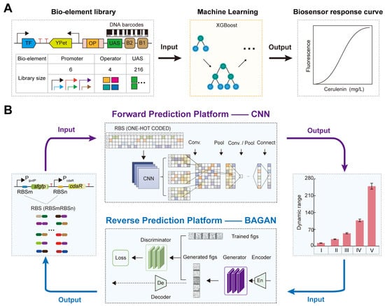 AI-designed bio-elements to fine-tune the TFB response performance: (A) The regulation of the cerulenin biosensor response curve based on the XGBoost model. (B) The forward–reverse prediction platform to fine-tune the TFB dynamic range. The forward engineering platform to precisely predict the TFB dynamic range based on the CNN model. The reverse engineering platform to rationally design the RBS with the desired TFB dynamic range based on the BAGAN-GP model.