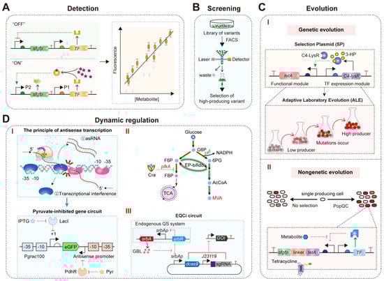 TFB-mediated directed evolution is a powerful strategy for the efficient production of target metabolites [40,110,111]. Optimized TFBs can enrich high-titer strains by responding to target metabolites and activating or inhibiting downstream gene expression [101,112,113,114]. For example, Seok et al. developed a synthetic biosensor responsive to 3-hydroxypropionic acid (3-HP) based on the C4-LysR biosensor and the TetA bioselector (Figure 8C(I)) [101]. Using a glycerol-dependent 3-HP production pathway as a model system, they performed adaptive laboratory evolution (ALE) to identify the optimal flux redistribution between the 3-HP biosynthesis pathway and the central carbon metabolism pathway, increasing the 3-HP titer and reducing acetate accumulation by alleviating overflow metabolism [101]. These results demonstrate that whole-genome evolution using synthetic biosensors can lead to effective carbon flux rewiring. Additionally, Shen et al. used a 4-hydroxyphenylacetic acid (4HPAA) biosensor combined with atmospheric and room temperature plasma (ARTP) mutagenesis and ALE to successfully obtain strains with high 4HPAA titer and tolerance [115]. The strains maintained genetic stability after 25 generations of genome shuffling [115]. Ultimately, strain GS-2-4 produced 25.42 g/L 4HPAA in a 2 L fed-batch culture bioreactor [115]. These results indicate that the strain has long-term genetic stability and high production levels, making it a potential candidate for industrial applications. Moreover, Tong et al. constructed a TFB responsive to (2S)-naringenin in E. coli based on TtgR [116]. Through directed evolution and saturation mutagenesis, they identified a chalcone synthase (CHS) mutant, SjCHS1S208N, with 2.34-fold increased catalytic activity [116]. Fermentation in a 5 L bioreactor increased the de novo (2S)-naringenin concentration to 2513 ± 105 mg/L, the highest concentration reported in a stirred batch bioreactor to date [116]. Overall, these directed evolution strategies can be broadly applied to engineer biochemical production pathways without the need for labor-intensive procedures.