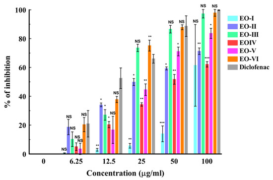 3.6. In Vitro Anti-Inflammatory Analysis of EOs