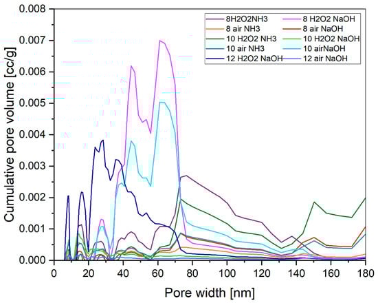 Interesting particle size distribution is shown by samples 8 H2O2 NaOH and 8 air NaOH. Both samples are characterized by the same shape of particle size distribution only shifting toward higher values in the case of the 8 air NaOH sample.