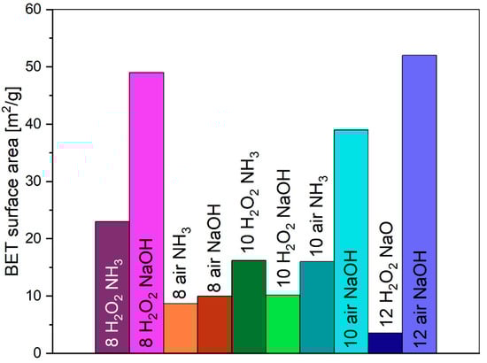 Synthesized pigments have up to five times greater specific surface area than commercial pigments (values up to 10 m2/g) [65]. Pigments synthesized by microwave-based reaction have a specific surface area in the range of 4–52 m2/g (Figure 5). Oxidation agents do not affect the specific surface area much; however, pigments precipitated with sodium hydroxide are characterized mostly by higher specific surface area values.