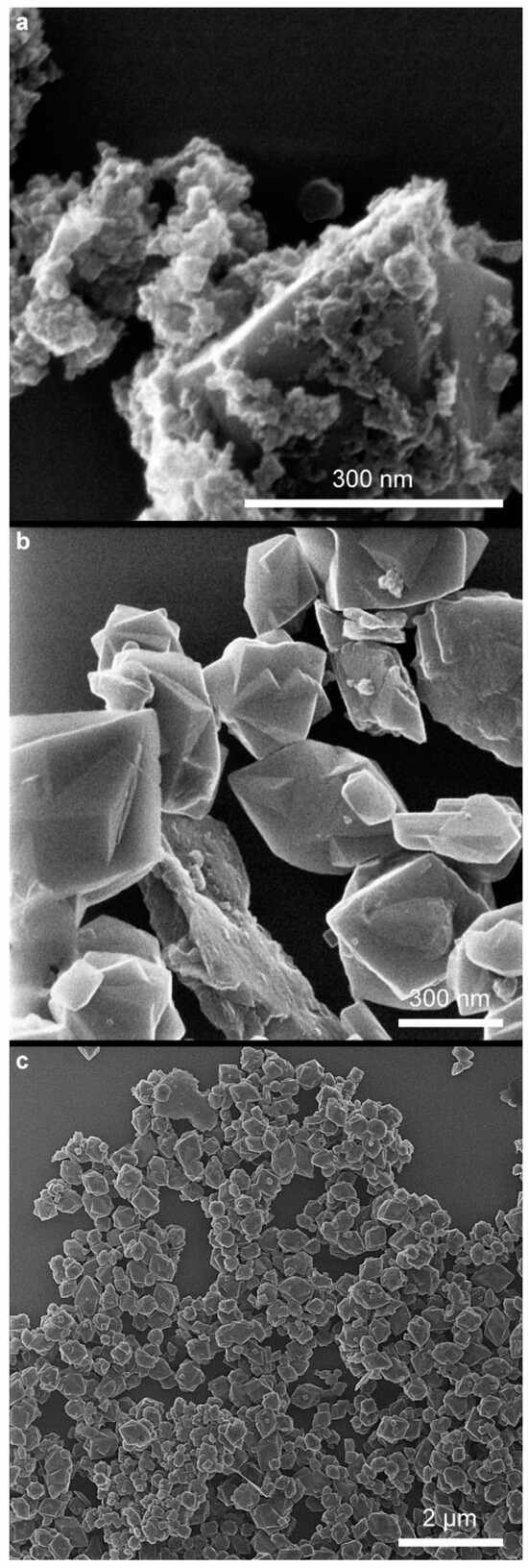 From analyzing the HIM images (Figure 6, Figure 7 and Figure 8), it can be concluded that the samples synthesized at pH = 8 have an irregular particle shape, similar to cubes. In the case of sample 8 air NaOH, we observe an interesting structure—large hematite particles on which finely crystalline magnetite has been deposited, as confirmed by XRD results. Samples synthesized at pH = 10 are characterized by visible cubic particle shapes with small particle sizes, confirming the XRD and DLS results. The same cubic particle texture has been observed in previous studies [50] (Figure 9). For samples synthesized at pH = 12, we see a rather irregular particle texture. In the case of sample 12 H2O2 NaOH (Figure 8c), it can be concluded at first that the sample is very homogenous with larger particles than in other syntheses. However, looking into a deeper texture (Figure 8b) it is seen that the structure is for sure not as homogenous as at first sight—as seen in the rhombic shape of particles with many defects. Most of the samples are homogenous in the size of particles.