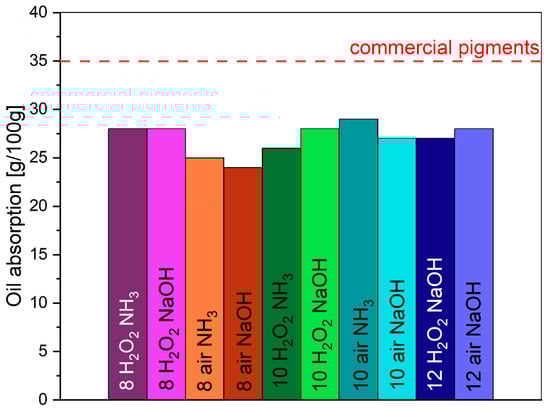 The oil absorption of synthesized pigments is in the maximum value of 35 g/100 g [65]. Microwave-based pigments in this study have much a lower oil absorption rate in the range of 24–28 g/100 g (Figure 11). It is connected with good crystallinity of materials and a low specific surface area.