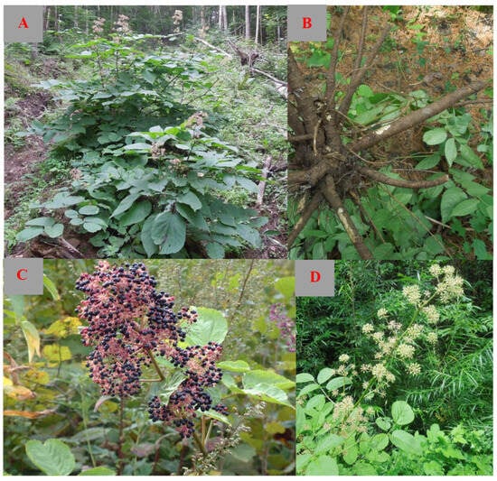 Morphology of Aralia continentalis: aboveground part (A), root (B), fruit (C), and flower (D).