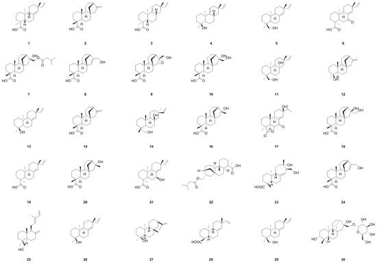 Currently, diterpenoids are typically found in the genus Aralia [115], serving in particular as distinctive components of A. continentalis. A total of thirty diterpenoid components (1–30), each possessing unique structural features and pharmacological properties, have been successfully isolated or identified (Table 1, Figure 3). This renders them an intriguing subject for ongoing scientific investigation.