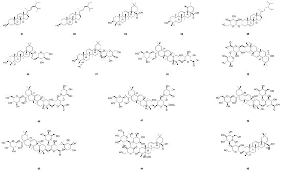 The genus Aralia is abundant in steroids and triterpenoids [115]. Currently, A. continentalis has yielded fifteen steroids and triterpenoids (31–45), as detailed in Table 2 and Figure 4. Each of these compounds represents distinct opportunities for further exploration and pharmacological research. Stigmasterol (31), which was extracted from A. continentalis, has shown significant inhibitory effects on the growth, acid production, adhesion, and synthesis of water-insoluble glucan by S. mutans [17]. These discoveries indicate that stigmasterol may effectively counteract the cariogenic properties of S. mutans, thereby justifying the traditional practice of utilizing A. continentalis extracts for treating dental ailments among local populations.