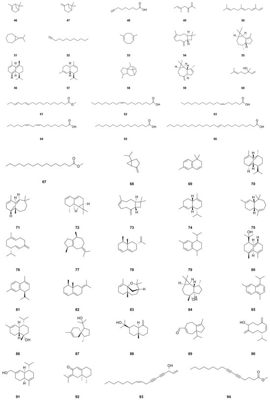 To date, forty-nine volatile compounds (46–94) have been identified and studied from A. continentalis (Table 3, Figure 5), offering extensive possibilities for further exploration of their therapeutic and bioactive attributes. Out of these, sixteen compounds were identified in the volatile oil extracted from A. continentalis roots, accounting for 92.88% of the total content, with α-pinene (46) comprising 41.22% [24]. Our previous research identified thirty compounds in the GC-MS analysis of the volatile oil from A. continentalis roots, accounting for 98.9% of the total composition [25]. These primary constituents include compound 46 (65.0%) and others such as (+)-α-amorphene (74), (–)-nootkatene (78), β-eudesmol (88), and more. This volatile oil displayed modest antioxidant properties, achieving scavenging rates of 22.3% and 16.8% for DPPH and ABTS, respectively. Its IC50 value for α-glucosidase inhibition was 79.2 μg/mL, which was comparable to the positive control acarbose. However, our findings differ from previous reports on volatile components [25], and this variation can be attributed to various factors: (1) Genetic differences affect plants’ response to stimuli, influencing volatile oil synthesis. (2) Environmental factors like light, temperature, and soil affect plant growth and volatile oil synthesis. (3) Plant compounds vary with developmental stages due to changing biological needs. (4) External stimuli, both biotic and abiotic, trigger defense reactions and alter volatile components [116]. In summary, volatile oil composition differs due to genetics, environment, development, and external stimuli, reflecting plant adaptability and survival strategies.