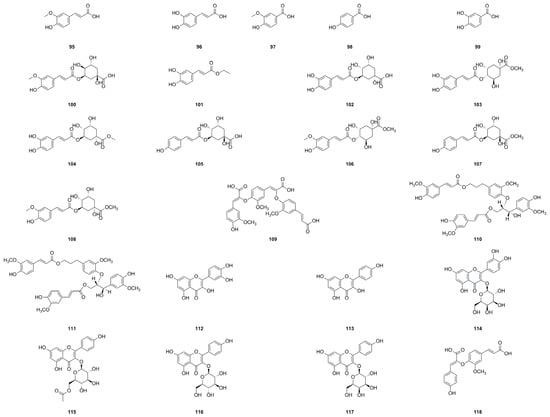 In recent years, phenolics have garnered considerable attention owing to their potential role in preventing chronic and degenerative diseases, which are among the leading causes of mortality and disability in developed countries. The intake of phenolics through dietary sources has been linked to several positive health effects [117]. In the roots and leaves of A. continentalis, twenty-four phenolics (95–118) have been effectively extracted and identified, showcasing the plentiful presence of these bioactive compounds in the plant. These findings are detailed in Table 4 and Figure 6.