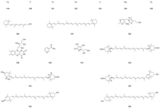 Eighteen vitamins and trace elements (119–136) have been effectively extracted and characterized from the roots and leaves of A. continentalis, as detailed in Table 5 and Figure 7. A comprehensive report investigated the nutritional and functional components of this plant, revealing its abundance of various nutrients [30]. Generally speaking, the content of water, carbohydrates, crude fiber, and crude protein is relatively high. Among the inorganic components, potassium (123) holds the topmost concentration, followed by calcium (119), phosphorus (120), natrium (122), and magnesium (124). In terms of vitamins, β-carotene (127) is found to have the highest content. The crude saponin content in both the roots and leaves is similar, exhibiting strong antioxidant activity. Furthermore, the dietary fiber and chlorophyll content of both the roots and leaves are also significant. These findings indicate that A. continentalis possesses potential nutritional value and functional characteristics, making it a promising source for various applications.