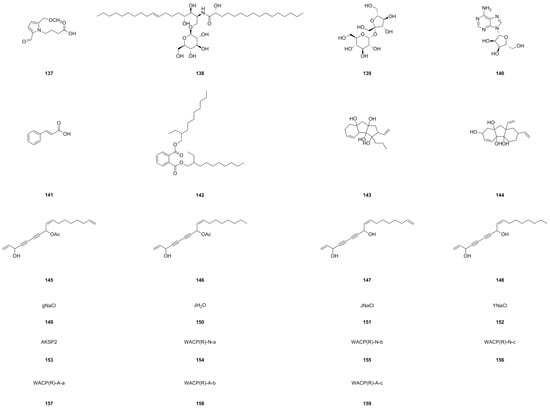 In addition to the compound types mentioned earlier, researchers have successfully isolated and identified an additional twenty-three unique compounds (137–159) from different parts of A. continentalis, including its roots, leaves, and stems (Table 6 and Figure 8). These remarkable discoveries emphasize the extraordinary diversity and intricacy of the bioactive compounds harbored within A. continentalis, further highlighting its immense potential for exploration and utilization in the fields of pharmacology and medical research.