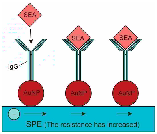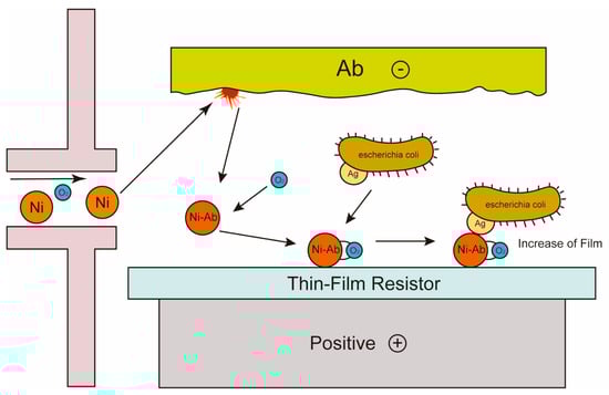 Voltammetry biosensors assess the presence and concentration of bacteria and contaminants by measuring the current change at the applied potential, and the strength of the current has a certain linear relationship with the concentration of the substance to be measured [,]. In electrochemical sensors, voltammetry is a commonly used technique, including cyclic voltammetry, square wave voltammetry, and stripping voltammetry. For example, in bacterial detection, voltammetry biosensors can quickly and sensitively identify and quantify bacterial species, such as the label-free amperometric biosensor for E. coli O157:H7 []. A previous study proposed an amperometric biosensor platform for the detection of pathogenic E. coli O157. The biosensor was based on the immunological principle of antibody-antigen interaction, in which antibodies were covalently bound to the surface of a nickel oxide (NiO) thin film substrate by sputtering technology as show in Figure 1. The NiO substrate accelerated charge transfer and provided excellent support for antibodies, which improved target acquisition efficiency and enabled the direct detection of E. coli O157 without labels. Electrochemical detection results showed that the sensor had a wide linear range of 101–107 cells/mL and was highly selective and specific to other bacterial species. In addition, electrochemical biosensors usually modify marker materials on recognition elements to amplify detection signals, thus realizing low abundance detection. For example, the principle of the interaction between nano-anti-schistosomiasis conjugate and Soluble Egg Antigen (SEA) was studied, and the structure of the nano-biosensor was characterized by rabbit anti-schistosomiasis antibody as show in Figure 2. In the presence of antibodies, the gold nanoparticles (AuNPs) strips were oxidized to form active gold oxides with electrons, which produced redox-reduction signals, and then analysed by cyclic voltammetry. Studies showed that the detection concentration of schistosomiasis antigen in faeces ranged from 1.13 × 101 ng/mL to 2.3 × 103 ng/mL. The results showed that the test strip could be used to detect schistosomiasis antigen in real samples []. Recently, a team has researched and developed an electrochemical biosensor that combined side-flow technology and electrochemical technology to detect E. coli O157 []. The electrodes were installed below the lateral flow detection line, while organic–inorganic nanoparticles prepared with E. coli O157-specific antibodies were attached to the lateral flow detection line. When E. coli O157 was detected, the organic–inorganic nanoparticle and E. coli O157 antimicrobial peptide-labelled ferrocene sandwich structures were formed on the lateral flow detection line. The team developed a portable current detection device and used a smartphone-based device to detect current signals. The electrochemical biosensor could specifically detect E. coli O157 with an LOD of 25 CFU/mL.