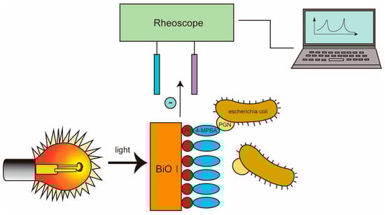 The photoelectric chemical (PEC) sensor is a kind of sensor technology based on electrode/interface photoinduced electron transfer process. Due to its high sensitivity, high anti-interference, and high-cost performance, it has become more and more popular in recent years. The PEC biosensor is a kind of biological detection technology based on photoelectric chemical reaction. The basic principle is that when light shines on the photosensitive material, the light energy is converted into electrical energy, which triggers the photoelectric chemical reaction, so as to achieve the detection of biological targets. Some teams [] selected BiOI semiconductor films as photoelectric conversion units and visible light drive (VLD) photocatalytic antibacterial units, AuNPs as linking units, and 4-mercaptophenylboric acid (4-MPBA) as antibiotic-free capture units. Based on the reversible binding of boric acid groups to peptidoglycan on the bacterial cell wall, the integrated photoelectrochemical PEC platform had excellent capture performance and a high detection sensitivity for E. coli, with an LOD of 46 CFU/mL. Photochemical strategies can also use conjugated polymers to distinguish microbial pathogens, and a team [] has used cationic poly derivatives (PPVs) as photochemical biosensors, as shown in Figure 3. PPVs have excellent photoelectric conversion properties and can bind to pathogens through electrostatic and hydrophobic interactions. PPV was excited under 450 nm light irradiation and transferred electrons to oxygen in the electrolyte, producing a strong photocurrent signal. After the introduction of pathogenic bacteria, steric hindrance was generated to block electron transfer, and a signal-off type PEC sensor was proposed. The different size of pathogenic bacteria showed different resistances of electron transfer, which resulted in different degrees of decreases of the photocurrent. Based on this principle, pathogenic microorganisms could be easily and sensitively identified. The sensor could detect different concentrations of pathogenic microorganisms in the range of OD600 = 0.5 to 2 and showed the linear relationship between the photocurrent density and the concentration of pathogenic microorganisms, according to the principle of simple and sensitive identification of pathogenic microorganisms. A new label-free PEC immune sensor platform based on rare earth doping and quantum dots (QDs) sensitization scheme has been developed for Vibrio parahemolyticus (VP) detection []. The doping of CdSe nanoparticles improved the absorption of TiO2 in the visible region and enhanced the photocurrent response of PEC sensors. This PEC immune sensor had an LOD of 25 CFU/mL and a wide detection range of 102~108 CFU/mL, with high stability, low price, and a short detection time. The sensor could be used to detect other pathogenic microorganisms by replacing antibodies, so the sensor is expected to be one of the fast and ultra-sensitive detection of pathogenic microorganisms in medical wastewater.
