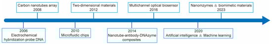 Since the application of electrochemical hybridization probe DNA technology in 2006 [], the field of electrochemical biosensors has experienced significant progress, and the development of electrochemical hybridization probe DNA sensors has further improved the level of unlabelled nucleic acid detection. In 2008 [], carbon nanotubes were combined with electrochemical biosensors for the detection of microbial metabolites. In 2010 [], a team combined microfluidic chips with electrochemical biosensors for the rapid detection of bacteria and viruses. Microfluidic technology enables automated sample handling and analysis and improves the detection efficiency. In 2012 [], the introduction of two-dimensional materials improved the sensitivity of electrochemical biosensors. In 2014 [], the development of nanotube-antibody-DNAzyme composites led to the construction of highly sensitive immunosensors for pathogen detection. In 2016 [], through a portable electrochemical biosensor combined with multichannel optical biosensor and a smartphone, real-time data transmission and remote monitoring through wireless communication technology could be used for large-scale environmental microbial monitoring. In 2020 [], artificial intelligence (AI) and machine learning algorithms were used for data processing and analysis, improving the accuracy and efficiency of microbial detection. In 2023 [], the development of nanozymes and biomimetic materials was widely used in electrochemical biosensors, which further improved the stability and detection sensitivity of sensors, marking another major breakthrough in electrochemical biosensor technology. The specific flow chart is shown in Figure 4. The current electrochemical biosensor design has a flexible structure, mainly through its combination with the excellent performance of nano functional materials [] and sophisticated microfluidic chip technology []; this kind of sensor shows a high detection capability. At the same time, the rapid development of AI learning in recent years has brought beneficial changes in many fields, including the field of the environment. Internet-based electrochemical biosensors can conduct AI learning through big data statistics and other methods, as well as analyse medical wastewater to predict the current epidemic trend in the region [], which has great research value and application potential.