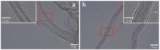 The surface morphologies of pristine MWCNTs and MWCNTs@CCh-PEI were examined using TEM and SEM. Figure 2 shows the TEM images of pristine MWCNTs and MWCNTs@CCh-PEI. It can be seen that the outer diameter of pristine MWCNTs was approximately 20–30 nm (Figure 2a). Figure 2b reveals that the thin polymer layer coated the outer surfaces of MWCNTs with a thickness of about 4 nm. The tubular structure of pristine MWCNTs was not destroyed, illustrating the successful co-deposition of CCh and PEI on pristine MWCNTs via mussel-inspired chemistry, as reported by other studies [27,28].