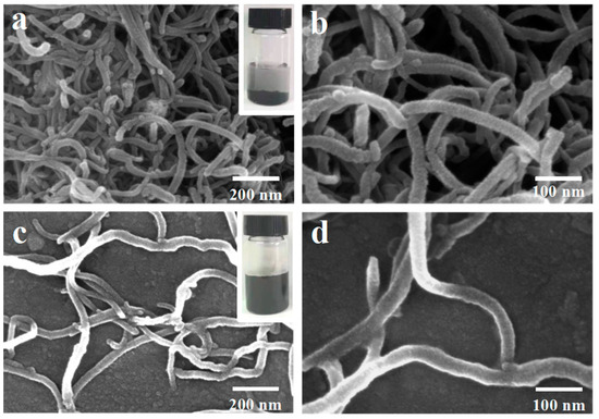 SEM images of pristine MWCNTs (Insert: dispersion of pristine MWCNTs after Scheme 30 min) (a-low magnification image, b-high magnification image) and MWCNTs@CCh-PEI (Insert: dispersion of MWCNTs@CCh-PEI after standing for 30 min) (c-low magnification image, d-high magnification image).