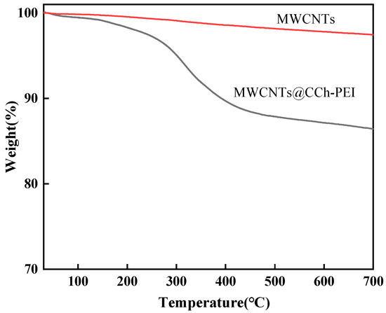TGA was used to estimate the thermal stability of pristine MWCNTs and MWCNTs@CCh-PEI. As shown in Figure 4, it can be observed that pristine MWCNTs did not show a significant mass change trend from 30 to 700 °C. In the same temperature range, MWCNTs@CCh-PEI lost about 13.58% of its weight. The 1.69% weight loss from 30 to 200 °C is due to the volatilization of physically adsorbed water. The apparent 10.44% weight loss from 200 to 500 °C is attributed to the decomposition of polymers formed by CCh and PEI [29]. Moreover, approximately 1.45% of the weight loss is due to the decomposition of amorphous carbon or impurities until the temperature reaches 700 °C. The above analysis indicates that MWCNTs@CCh-PEI was successfully prepared.