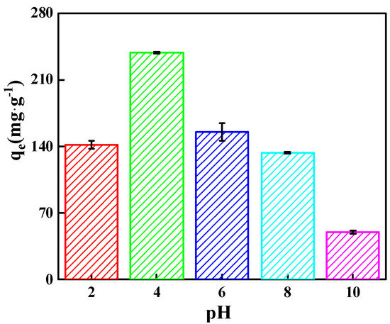 The solution pH impacts the adsorbent’s surface properties/charge density and the dye molecules’ charge/structure. It is a vital element in the dye adsorption process [31]. Figure 6 illustrates the influence of pH on the amount of MO adsorbed on MWCNTs@CCh-PEI. As the solution pH increased from 2 to 4, the absorbed amount of MO increased. This is attributed to the fact that the abundant amino groups on the surface of MWCNTs@CCh-PEI are protonated to positively charged groups (-NH3+) at high concentrations of H+, which facilitates electrostatic interactions with anionic MO molecules in the aqueous solution [32]. However, the decrease in the amount of adsorbed MO at pH 2 was mainly due to the presence of excess H+ ions in the solution, which contributed to the protonation of the sulfonic acid ion (-SO3−) of MO and the formation of -SO3H at a solution pH lower than the pKa (3.4) of MO [3,33], leading to the weaken electrostatic attraction between MO and MWCNTs@CCh-PEI. With the increase in pH of the solution from 4 to 10, MWCNTs@CCh-PEI was gradually deprotonated, decreasing the positive charge density on the surface of MWCNTs@CCh-PEI. The diminished electrostatic interaction between MWCNTs@CCh-PEI and MO leads to lower adsorption capacity. Thus, the pH of the solution was set to 4 in the other experiments [3].