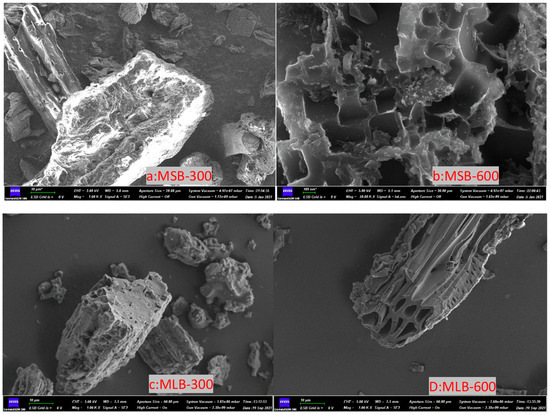 SEM characterization was applied to analyze the surface morphology of the studied biochar. It can be seen from Figure 1 that the two biochars (maize straw- and mulberry leaf-derived) generated at 300 °C still retained the original skeleton and structure of the raw materials [17]. With the increase in pyrolysis temperature (600 °C), the surface of biochar becomes rougher, and the pore structure becomes more obvious [18].