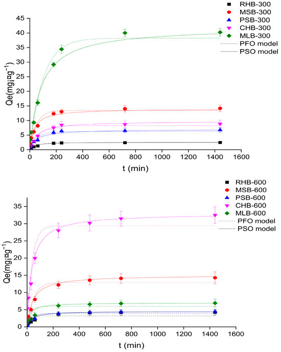 Figure 3 illustrates the kinetic fitting diagram of Cd(II) adsorption by various biochars. The adsorption process can be divided into three stages: rapid adsorption, slow adsorption, and dynamic equilibrium. Initially, during the early stages of the adsorption reaction, the Cd(II) adsorption capacity of biochar increased with time. After 90 min of adsorption, the adsorption reached a state of equilibrium, indicating that biochar exhibited a relatively fast adsorption rate for Cd(II). In the initial stage, the adsorption amount increased rapidly due to the abundance of adsorption sites on the biochar, predominantly on its outer surface. As the adsorption process progressed, the adsorption sites on the biochar approached saturation, resulting in a slower adsorption rate until reaching adsorption equilibrium. Among the biochar samples prepared at the same temperature, MLB-300 demonstrated the highest adsorption capacity for Cd(II), reaching up to 38.23 mg·gcm−1, significantly surpassing the other four biochars.