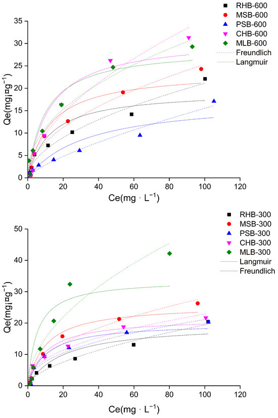 Among the biochars prepared at the same pyrolysis temperature, MLB-300 exhibited superior adsorption effectiveness with a maximum adsorption capacity of 42.2 mg·g−1. However, biochars derived from the same biomass at different temperatures demonstrated a certain promotion effect on the adsorption of Cd(II) due to the increased temperature during the pyrolysis process. For instance, the maximum adsorption capacity of CHB-600 was 31.3 mg·g−1, surpassing that of CHB-300, which was 21.7 mg·g−1, except for both MLB and RHB.