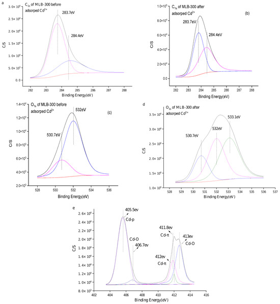 XPS spectra of mulberry biochar (treated at 300 °C) before and after Cd(II) adsorption. (a,b) C1s XPS spectra of MLB-300 before and after Cd(II) adsorption, respectively. (c,d) O1s XPS spectra of MLB-300 before and after Cd(II) adsorption, respectively. (e) Cd 2p XPS spectra of MLB-300 after Cd(II) adsorption.