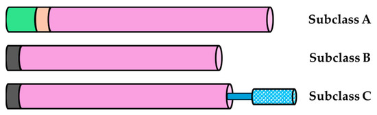 Schematic representation of the structure of β-1,4-glucanases of the GH9 family of plants. The subclasses are composed of the cytosolic domain (green), transmembrane domain (pink), signal sequence (dark gray), GH9 catalytic domain (purple), linker region (thick blue line), and CBM49 carbohydrate-binding module (blue dots) (adapted from Urbanowicz et al. [27]).