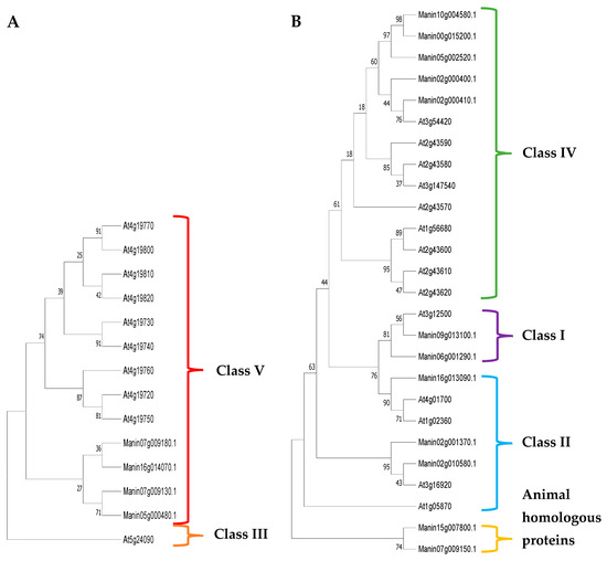 Phylogenetic trees of M. indica chitinases identified from the glycosylhydrolase family GH18 (A): class III (orange) and class V (red); and GH19 (B): class I (purple), class II (blue), class IV (green), and homologous animal proteins (yellow). The M. indica chitinases (Manin) were found in all but class III chitinases from A. thaliana. The percentage of trees in which the associated taxa clustered is shown next to the branches.