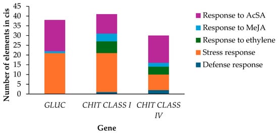Frequency of appearance of cis elements in three sequences that correspond to the genes GLUC, CHIT class I, and CHIT class IV of M. indica. The vertical axis indicates the number of cis-regulatory elements, and the horizontal axis shows the genes.