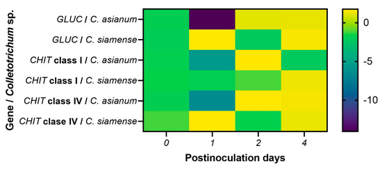 Relative gene expression analysis showed that the GLUC gene was expressed on day 1 in fruit inoculated with C. siamense, while it was expressed 2 days post-inoculation (dpi) in those inoculated with C. asianum. In addition, the response to both pathogens was maintained at 4 dpi. We observed an early induction in the expression of the CHIT class I gene in fruits inoculated with C. asianum compared to those inoculated with C. siamense, in which expression occurred at 4 dpi. The CHIT class IV gene was expressed early on day 1 in fruits inoculated with C. siamense and on day 2 in fruits inoculated with C. asianum (Figure 6). The pathogenicity and virulence of fungi can vary due to the genetic factors of the hosts and the environmental conditions in which they are found [2,6].