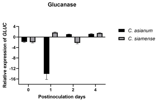 The primary hyphae of Colletotrichum spp., which have a hemibiotrophic mode of infection, are formed during its biotrophic phase. Subsequently, during its necrotrophic phase, secondary hyphae are formed [11]. Oliveira-Garcia and Deising [56] reported that β-glucan is necessary to stiffen the cell wall in fast-growing appressoria and the necrotrophic hyphae of Colletotrichum graminicola in maize. However, its synthesis is downregulated during biotrophic development. Colletotrichum siamense is more virulent and acts quickly to penetrate its host. It may be synthesizing β-glucans for the formation of an appressorium, explaining why the expression of glucanase in fruit subjected to C. siamense was positively induced at 1 dpi and again at 4 dpi (Figure 7). In contrast, the C. asianum isolate, which was less virulent, evaded the immunity caused by the downwardly synthesized β-glucan, and its GLUC expression was therefore induced at 2 dpi (Figure 7).