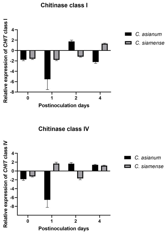 CHIT class IV was induced at the earliest dpi (1 and 2). However, CHIT class I was induced on the same day (2 dpi) when CHIT class IV was expressed in mango fruit inoculated with C. asianum; this is compared to the fruit inoculated with C. siamense, in which the expression of the CHIT class I gene was induced at 4 dpi (Figure 7). Some studies on rice plants provide information on the targets of chitinases, and these report that, in the early stage of pathogenesis, class IV chitinases release elicitor molecules from the fungal cell wall, and GlcNAc oligosaccharides activate the defense system. Subsequently, class I chitinases degrade the newly synthesized chitin chain of the fungus, inhibiting its growth [21,60]. The results in mango inoculated with C. siamense coincide with those reported in tomato inoculated with F. oxysporum, in which class IV chitinases were highly induced within 4 dpi and class I chitinases were positively induced only at 8 dpi [17]. We can also propose that C. siamense evades the mango immune system by delaying the expression of CHIT class I, causing larger necrotic spots to appear in the fruit [2].